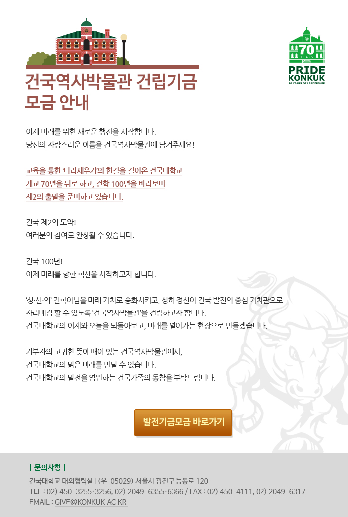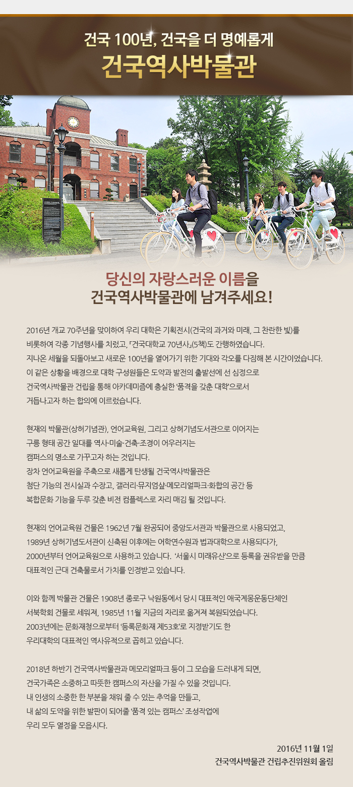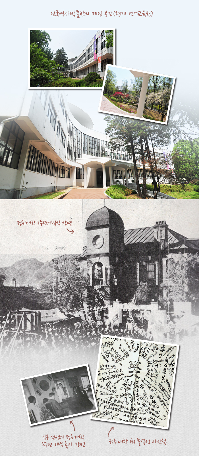 본관은 건국대학교의 부속 기관으로서 학교의 역사를 살펴보지 않을 수 없어 이 페이지를 준비하였습니다. 많은 자료가 준비되지는 못했지만 학교의 역사를 궁금해 하시는 학생들과 관련 연구직에 종사하시는 분들에게 도움이 되길 바랍니다. 건국역사박물관 건립 안내 인물 설립자 역대 이사장 역대총장 학교상징 교가 교시 기타 상징물 캠퍼스 옛날 모습 보기 현재 모습 보기 연표 건국대학교 연표 건국역사박물관 건립 안내