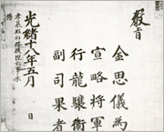 - 金思儀爲 善略將軍 行龍양衛 副司果者