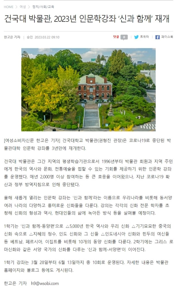 [교육] <여성소비자신문> 건국대 박물관, 2023년 인문학강좌 '신과 함께' 재개