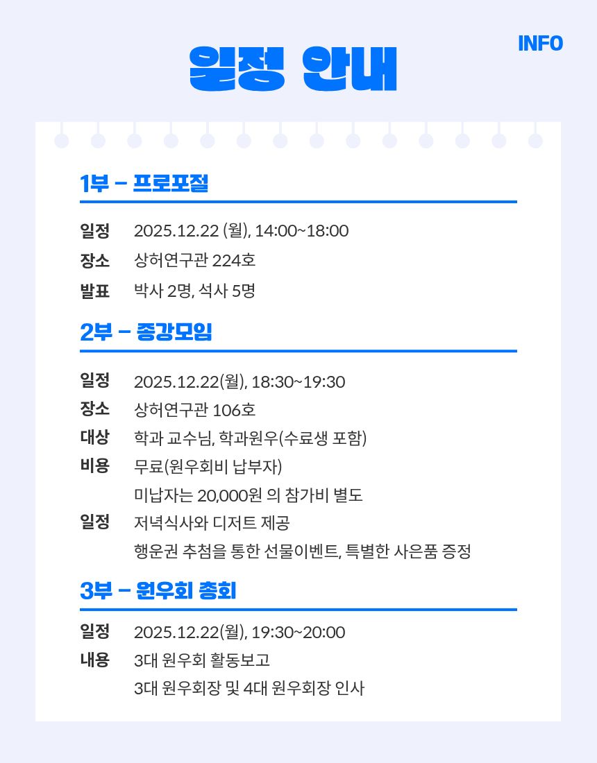 이에, 원우회에서는 수고한 나를 격려하고 학문의 길을 열어주신 교수님과 곁에서 힘이 되주어준 동료 원우들과 함께 서로를 격려하며 감사의 마음을 나누는 의미 있는 시간을 갖고자 종강모임을 준비하였습니다.