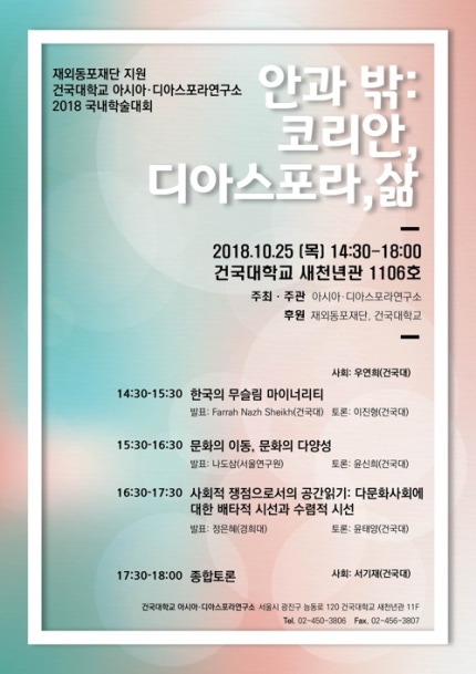 건대 디아스포라 연구소, '코리안, 디아스포라, 삶' 학술대회[건국대학교 아시아·디아스포라 연구소 제공] (서울=연합뉴스) 오수진 기자 = 건국대학교 아시아·디아스포라연구소는 오는 25일 오후 2시 30분 광진구 건국대학교 새천년관에서 '안과 밖: 코리안, 디아스포라, 삶' 국내학술대회를 연다.