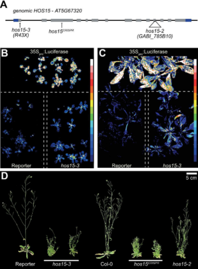 Figure 1. Identification of HOS15 involved in the transcriptional regulatory mechanism of miRNA. (A) Gene structure of genomic locus encoding HOS15 (gHOS15) showing a T-DNA insertion site in hos15-2, a nonsense mutation at amino acid residue 43; Arginine (R) in hos15-3, and the target region for the CRISPR system (hos15CRISPR). Gray boxes, exons; black lines, introns; flanking blue boxes, 5′ and 3′ UTR regions. (B and C) Bioluminescence activity as measured with a CCD camera in 14-day-old (B) and 25- day-old (C) hos15-3 mutants and control plants (reporter and 35Spro:Luciferase). The color ranging from low (blue) to high (white) represents the luminescence intensity. (D) Phenotypic characterization of control lines (reporter and Col-0), and hos15 mutants (hos15- 2, hos15-3, hos15CRISPR) having fully expanded siliques. Bar = 5 cm. To facilitate comparison and observation, each plant was photographed separately, digitally extracted, and mounted on a single panel with a black background.