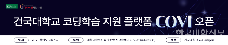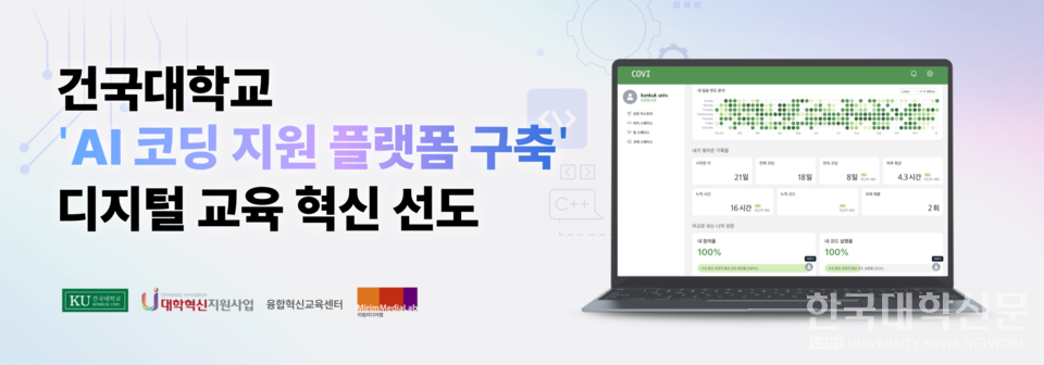 [한국대학신문 김경태 기자] 건국대학교(총장 원종필)가 올해 9월부터 전국 대학 가운데 최초로 AI 코딩 학습 플랫폼 ‘COVI(Code Evidence)’를 자체 서버 기반의 학습관리시스템(LMS)인 ‘건국대학교 e-Campus’에 구축해 운영하면서, 대학 교육의 ‘AI 전환’을 선도하고 있다.