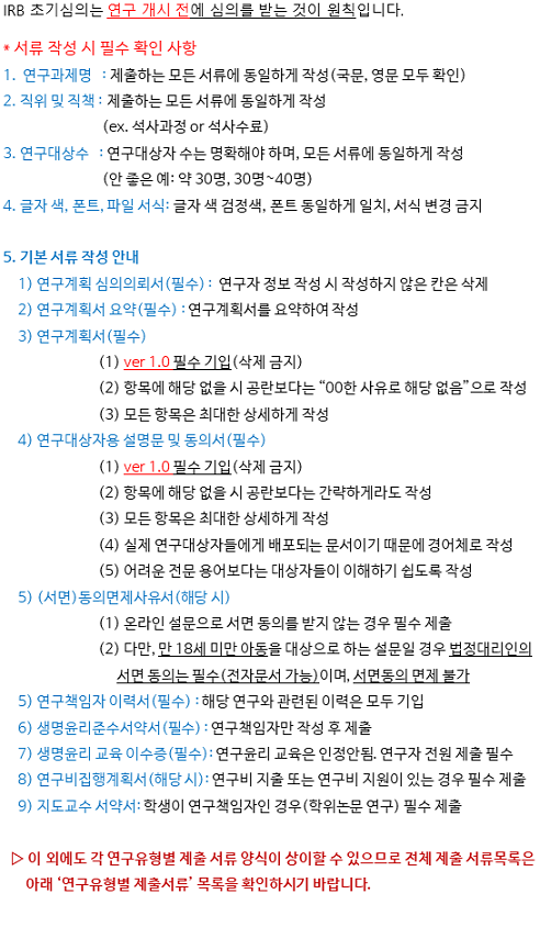 연구계획서 작성지침을 확인하여 서류 작성이 부족하지 않은지,