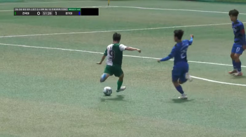 치열한 공방전이 이어지는 가운데 또 한 번 건국대에 기회가 찾아왔다. 후반 35분 경기대 공격 턴을 끊은 건국대는 빠르게 역습에 나섰다. 중원에서 공을 받은 김민겸이 길게 전방으로 패스를 찔러줬고 위쪽 라인에 있는 신승호가 공을 받아 돌파를 시도했다.