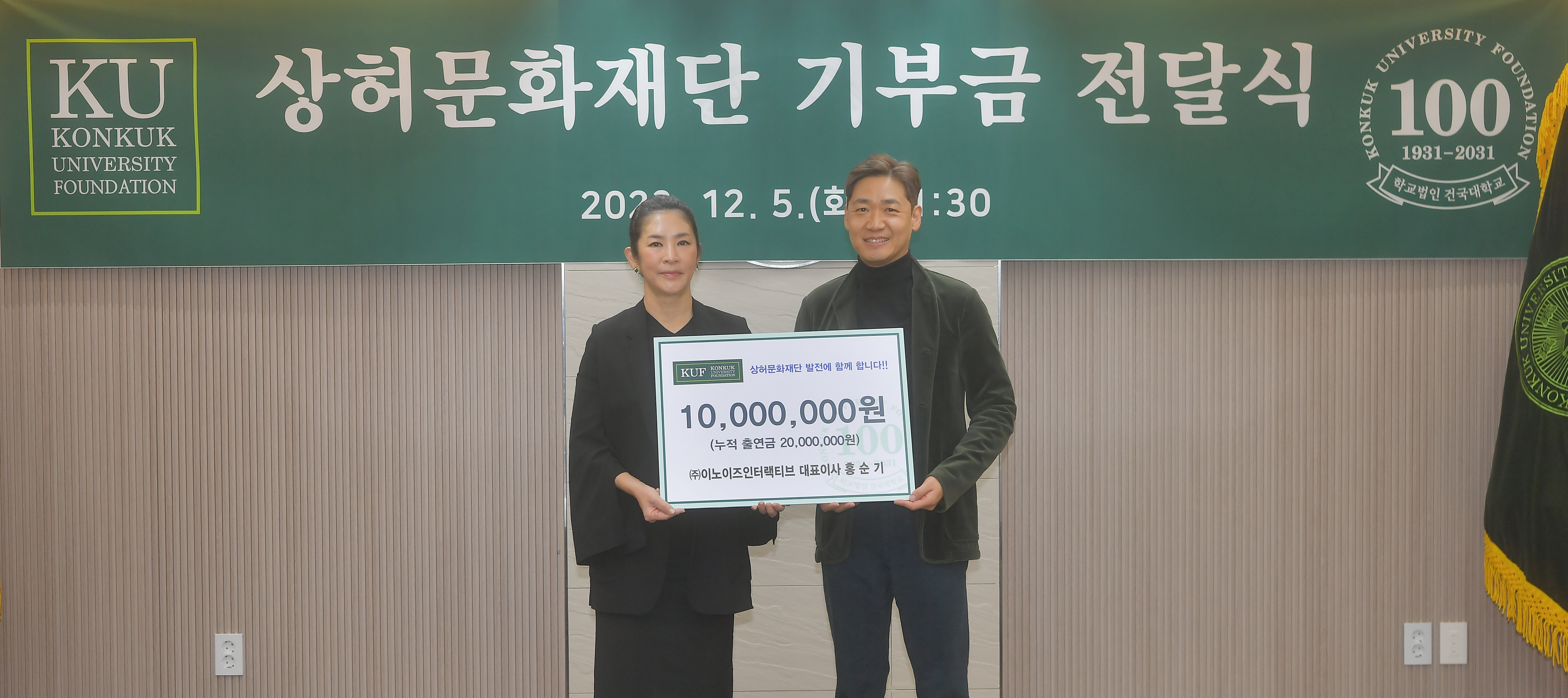 지난 5일에 진행된 기부금 전달식은 상허문화재단 유자은 이사장, 주식회사 이노이즈인터랙티브 홍순기 대표를 비롯해 상허문화재단 원종필 상임이사, 학교법인 건국대학교 김호섭 경영기획실장 그리고 이노이즈인터랙티브 허승원 이사 등이 참석한 가운데 진행됐다.