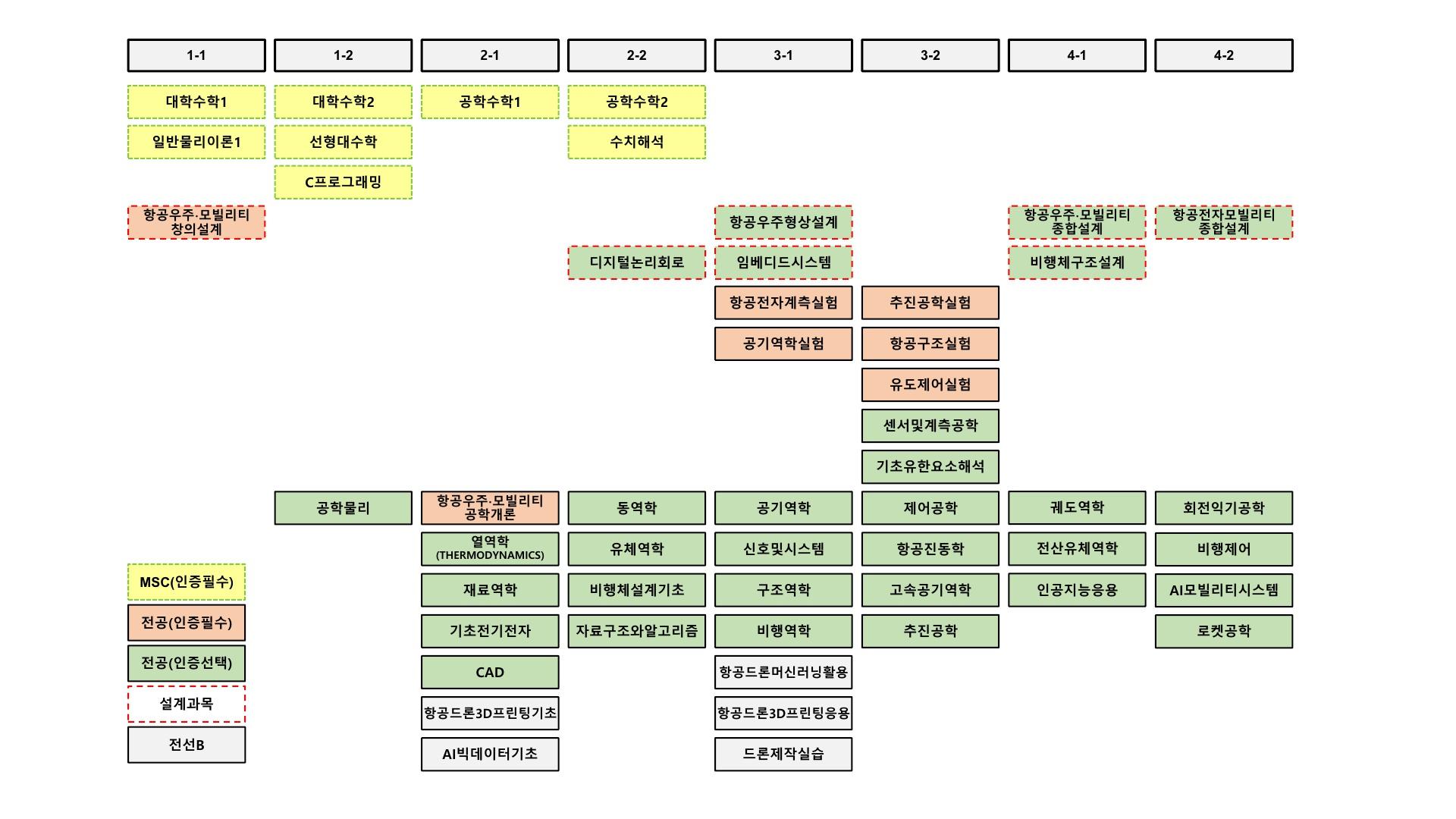 | 항공우주·모빌리티창의설계 | 1-1 | 항공우주·모빌리티종합설계 or 항공전자모빌리티종합설계 | 4-1,2 | ||