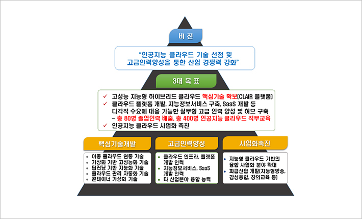 클라우드 인프라, 플랫폼, 딥러닝, 하이브리드 시스템 통합 등의 클라우드 핵심기술에 대한 연구개발을 통해 지능정보서비스를 위한 고성능 클라우드 기술개발, 서비스 구축 및 SaaS 개발 등의 다각적 수요에 대응 가능한 고급인력을 양성하고 이를 통해 사업화를 촉진