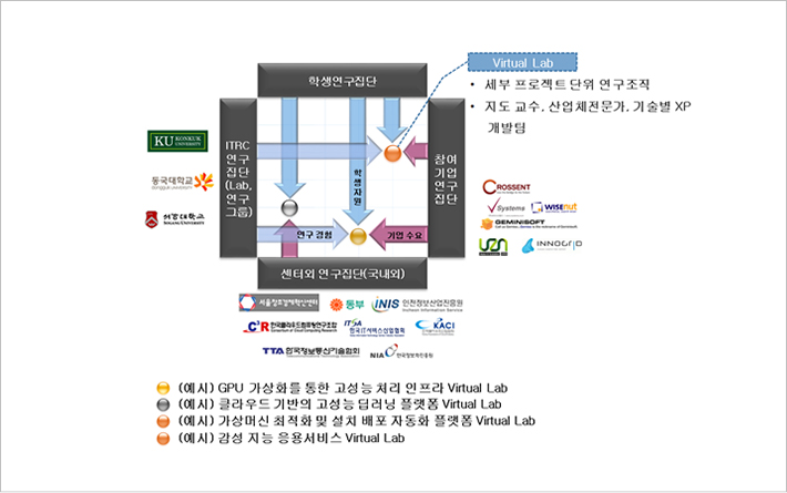 랩매트릭스의 Virtual Lab을 클라우드 기반의 융합형 테스트베드를 활용하여 각 세부과제별로 연계된 기술개발 모델을 구현함으로써, 산학협력의 결과를 교육과 추가적인 융합 기술 개발에 활용될 수 있도록 하고, 더 나아가 그 결과의 상용화를 지원하는 실제 적용 사례(reference site)를 제공