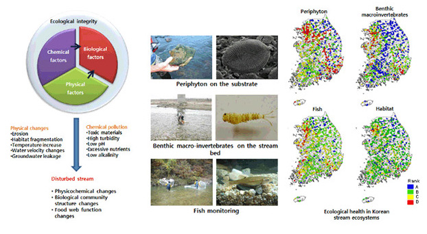 - Eco-health 연구: 수생태계 건강성 조사・평가・진단, 훼손된 하천생태계 복원 및 보전