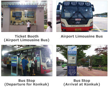 The best way to reach Konkuk University from Incheon International Airport is by airport limousine bus. Information regarding buses and limousines can be found at the passenger terminal. Look for Bus #6013. The first bus departs at 06:25 a.m. and the last bus at 22:55 p.m. You can buy a ticket at a booth right outside the airport arrival gate. It will cost you ₩10,000; you must pay in cash. The bus is available every 40 minutes.