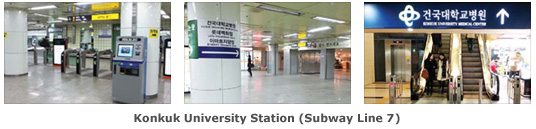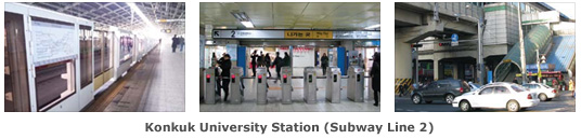 You can also use Subway Line 7 (Dark Green) and get off at Konkuk University Station (Kondae Ip Gu Yuck). Go out Exit 3 and follow the Konkuk University Hospital sign until you reach the escalators leading to the basement of the hospital. At the hospital, take the escalators leading to the 1st floor of the hospital. From there, you cannot miss the Konkuk campus.