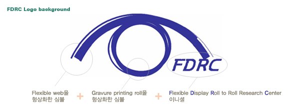 Flexible web과 gravure printing roll의 형상을 합쳐져 flexible display와 연결되는 가장 중요한 휴면 인터페이스인 눈을 상징했으며 나아가 미래를 지향하는 FDRC의 비전을 상징함.