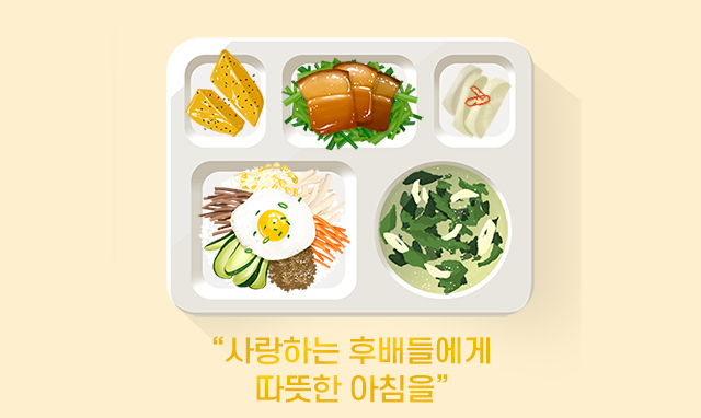 선배님들의 정성을 모아 후배들에게 보다 영양 가득한 식사를 제공하고자 하오니, 후배 재학생들이 더욱 건강하게 학업에 열중할 수 있도록 천원의 아침밥 사업 지원 기금에 많은 관심을 부탁드립니다.