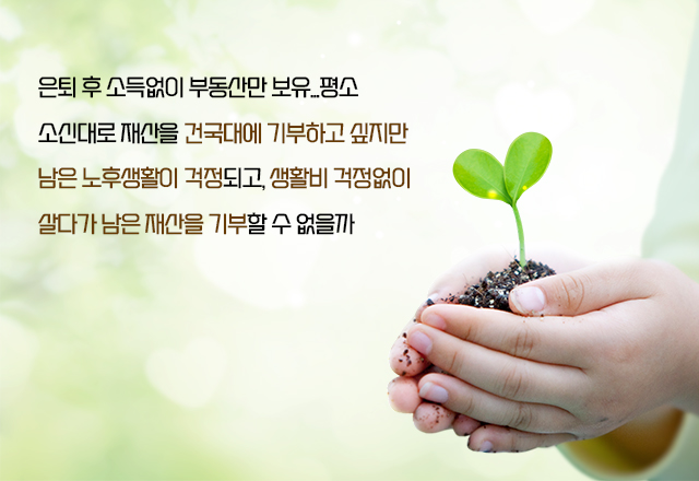 “금융회사와 업무협약”을 통해 기부자가 생전에 보유중인 부동산이나 금전을 활용하여 생계유지를 위한 생활비, 병원비 등을 충당할 수 있는 안정적인 재원을 마련하고, 기부자 사후에 미래 인재양성 등을 위하여 잔여 자산을 학교에 신속하고 안정적으로 기부하는 것을 이야기합니다.