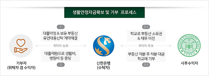 - 기부자 생전, 생활비, 병원비 등 재원확보를 위해 보유 부동산을 담보로 대출 약정을 체결하고, 기부자 사후에 잔여재산을 학교에 기부할 목적으로 해당 부동산을 신탁하는 유언대용 신탁 체결