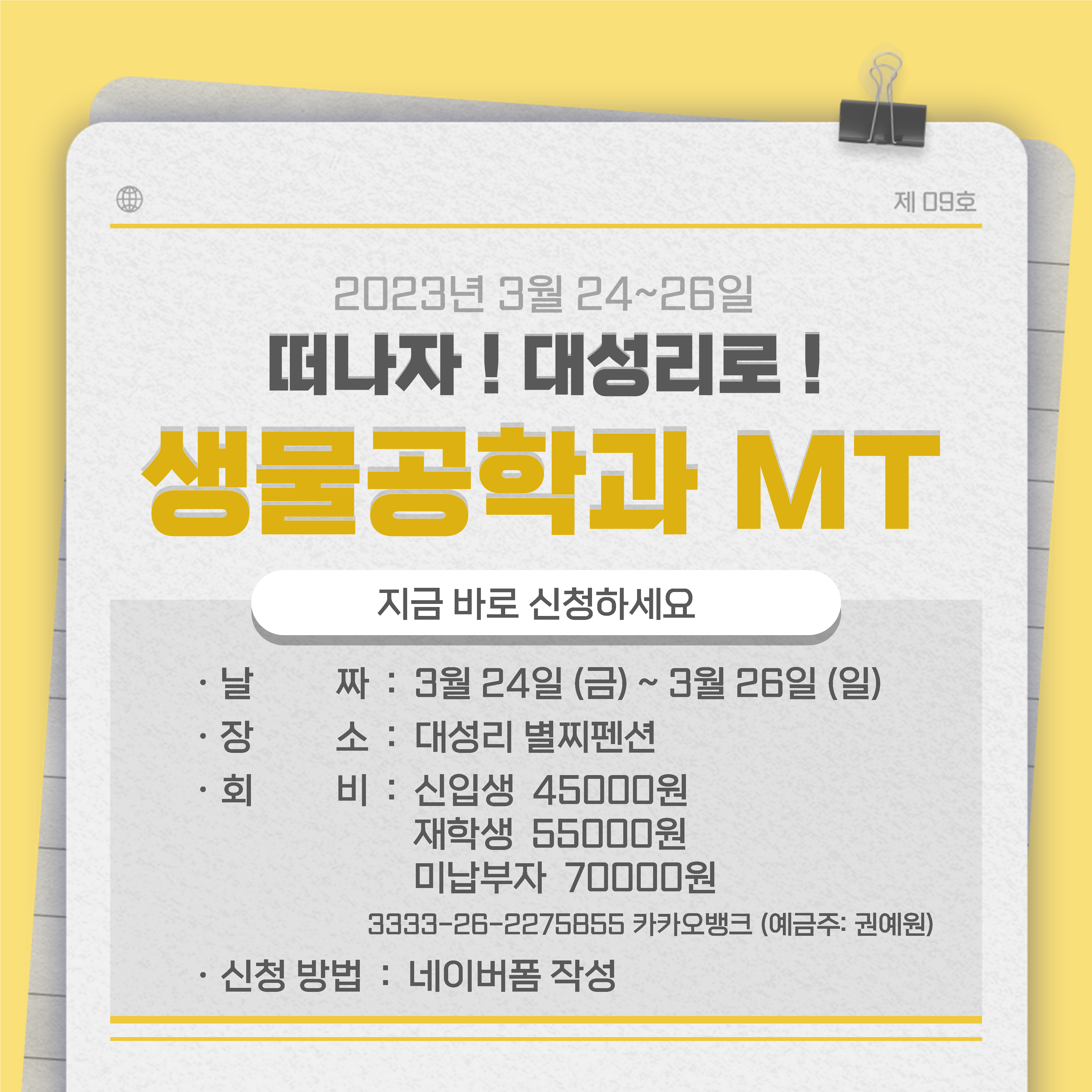 2박 3일간 진행된 생물공학과 총 MT는 4년만에 진행된 행사임에도 불구하고 높은 참여율을 보이며, 대성리에서 다 함께 행복한 추억을 쌓았습니다.