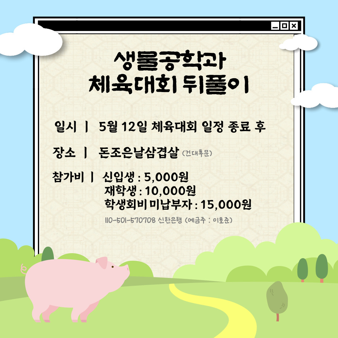 가장 큰 규모의 공과대학 체육대회에서 생물공학과는 학과 부스 운영 및 각 종 종목에 참여하여 활약을 펼쳤습니다.