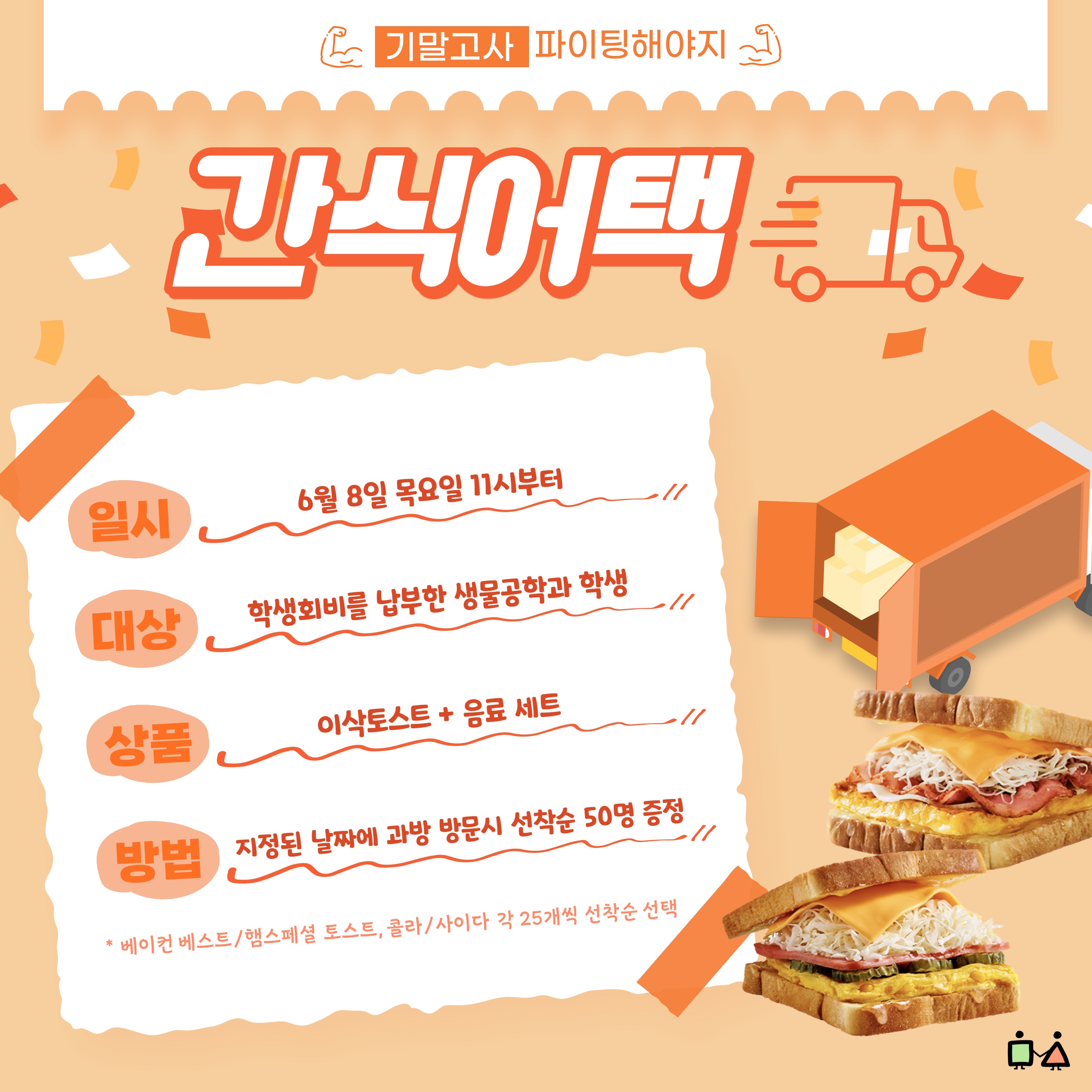 복지 사업의 일환인 간식어택 사업을 진행하여, 시험 시간 바쁘게 공부하는 학우 여러분들의 든든한 한 끼를 책임졌습니다.