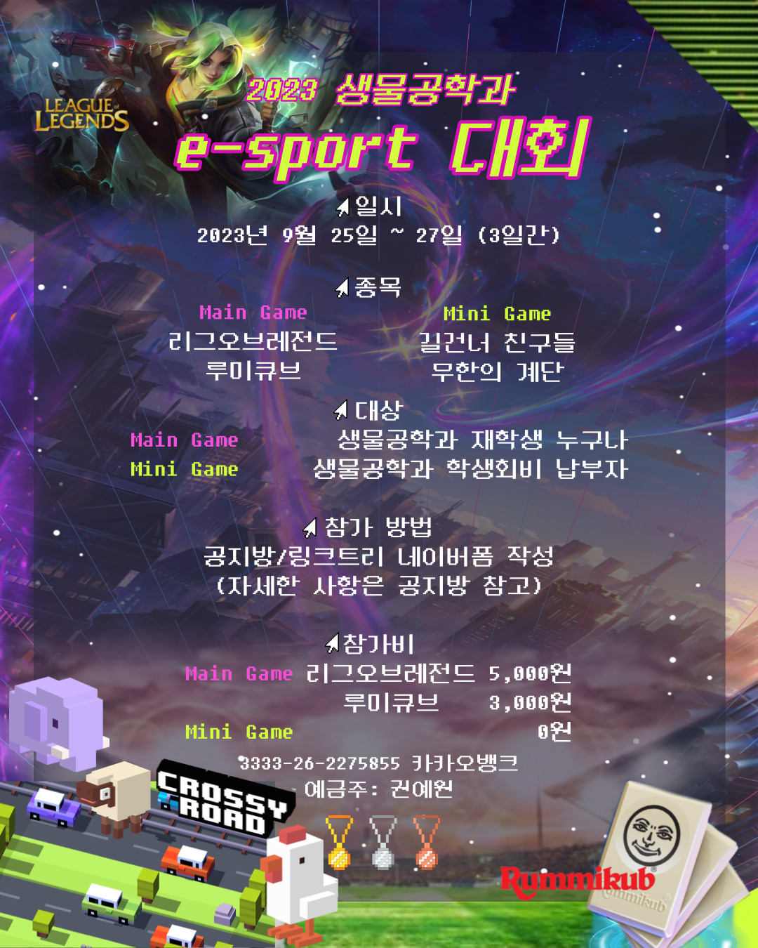 매년 진행하는 생물공학과 E-sports 대회에서 리그오브레전드, 루미큐브 등 여러 종목을 선정하여 학우 여러분들의 많은 호응을 얻었습니다.