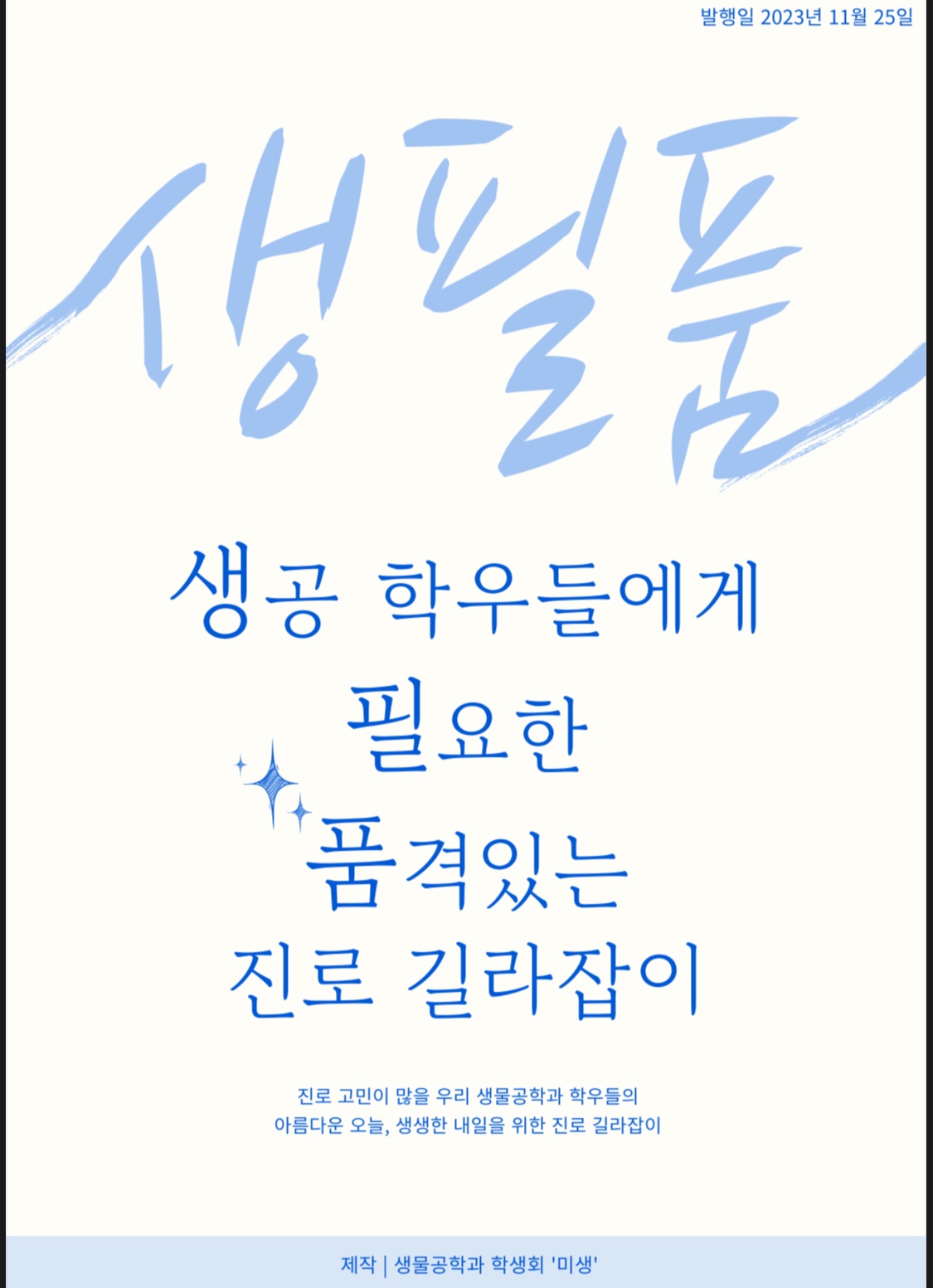 생동감과 함께 강의 정보, 교환학생, 대학원, 대외활동, 취업 정보 등 생물공 학과 학우 여러분들의 진로 개발에 도움이 되는 정보들을 모두 모아 진로 길 라잡이를 제작하였습니다.