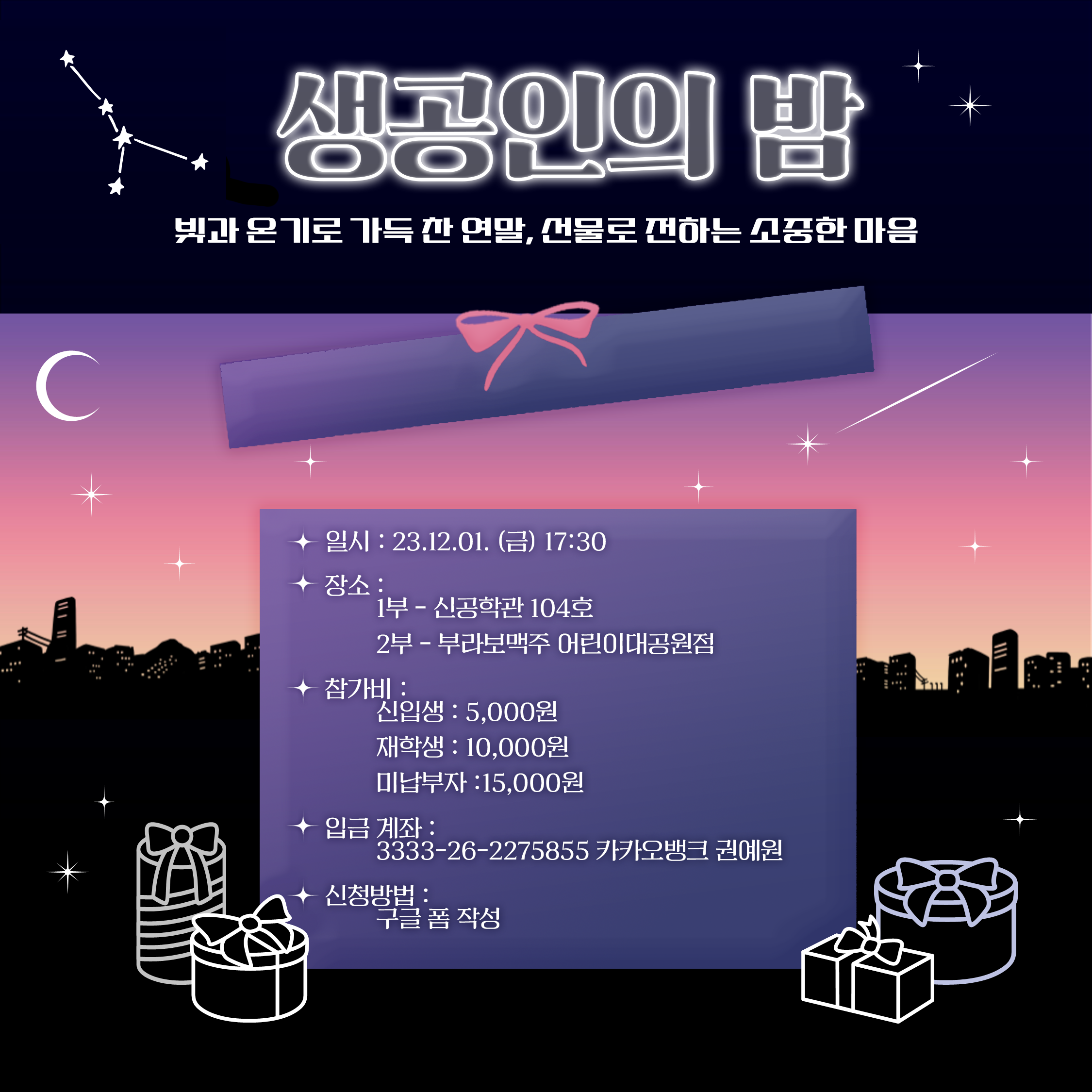 한 해를 마무리하는 생물공학과의 연말 행사이며, 교수님과 학우 분들을 초청 하여 송년회와 집행부의 이취임식을 진행하는 자리입니다.