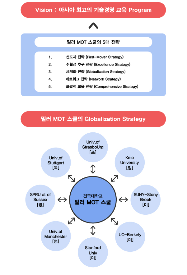 밀러MOT스쿨은 국내 최초의 경영학 기반의 기술경영 교육 프로그램으로서 국내 최고의 기술경영 교육서비스를 제공할 것입니다. 본 프로그램에서는 21세기 지식기반사회가 필요로 하는 기술과 경영 분야의 균형된 전문지식을 갖춘 인재양성을 목표로 합니다.
