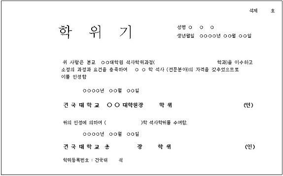 - ①석사과정의 소요학점을 이수하고 소정의 시험에 합격한 자로서 학위논문이 심사를 통과한 자 또는 이에 준하는 자에게는 별표 1과 같은 전문학위를 수여한다.