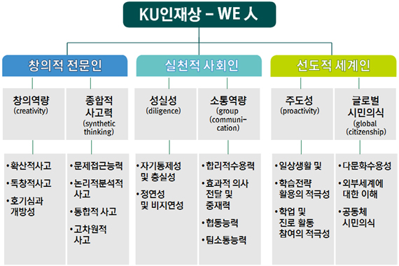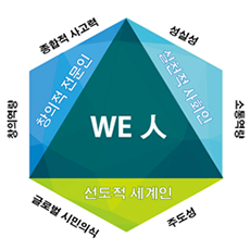 - WE人은 WE 세대의 특징을 반영하는 창의역량, 종합적 사고력, 성실성, 소통역량, 주도성, 글로벌 시민의식의 6대 핵심역량을 갖춘 창의적 전문인, 실천적 사회인, 선도적 세계인을 의미함.