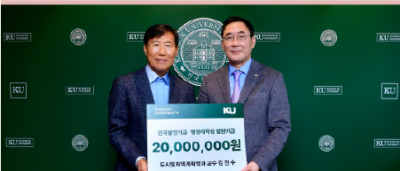 행정대학원 김진수 교수가 지난해 12월 2일 건국발전기금 1천만 원과 행정대학원 발전기금 1천만 원을 기부했다. 김진수 교수는 “전문 분야에서 지역사회에 기여할 수 있었던 것은 모교와 선배님들의 도움 덕분”이라며 “항상 은혜에 보답해야 한다는 마음을 가지고 있었는데, 이렇게 뜻을 전할 수 있어 감사하다”고 소감을 밝혔다. 원종필 총장은 “학교와 제자들을 향한 교수님의 따뜻한 나눔에 깊이 감사드린다”며 “기탁해주신 발전기금은 대학 발전과 행정대학원의 교육 환경 개선, 우수 인재 양성을 위해 의미 있게 사용하겠다”고 말했다. 김진수 교수는 건국대학교 법학과를 졸업하고 동 대학원에서 도시 및 지역개발학 박사 학위를 취득했으며, 현재 행정대학원 도시 및 지역 계획학과 주임교수로 재직 중이다.