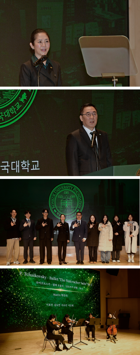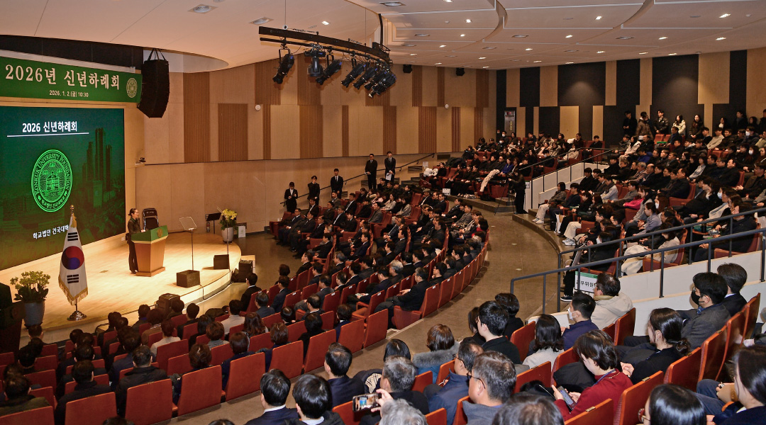지속적인 혁신으로 국내 대학 경쟁력 강화에 앞장서 온 건국대학교가 지난 1월 2일 건국대 학생회관 프라임홀에서 ‘2026년 신년하례회’를 개최했다. 이날 행사에는 유자은 이사장과 법인 임직원, 원종필 총장을 비롯한 교무위원·교수·직원, 부속 중·고등학교, 건국대학교병원과 건국대 충주병원, 건국유업·건국햄, 더 클래식500, 스마트KU골프파빌리온 등 산하기관 임직원 400여 명이 참석해 새해 비전을 공유했다. 유자은 이사장은 신년사에서 2026년 새해는 작년에 이룩한 ‘강한 건국’을 넘어, ‘건국은 위대하다’는 새로운 이정표를 향해 나아가는 한 해가 될 것이라며, “단순한 대학 순위보다 사회에 깊은 울림을 주고 시대를 이끌며 영향력을 발휘하는 ‘위대한 건국’이 되기를 소망한다”고 밝혔다. 이어 원종필 총장은 “서울캠퍼스의 ‘KONKUK WAVE 2031’ 발전계획은 연구, 교육, 글로벌, 브랜드 경영의 네 가지 축을 중심으로 ‘국내 Top5, 세계 100대 대학 진입’을 목표로 하고 있으며, 글로컬캠퍼스의 ‘KONKUK GLOCAL RISE UP 2031’ 발전계획은 현장실무 중심 교육, 평생교육 및 지·산·학 협력체계 기능 특성화를 통한 ‘지역특화 실무형 Cogito 전문인재 양성’을 목표로 하고 있다”며, 비전을 실현하기 위한 2026년의 노력 방향을 구체화했다. 신년사 이후에는 우수기관 및 우수직원에 대한 표창이 이어졌다.