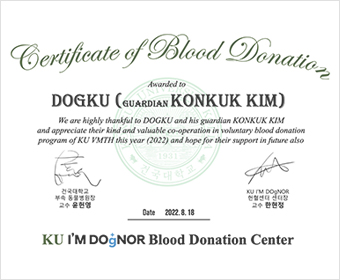 에서 3회 이상 헌혈 진행 시 건국대학교 부속동물병원 진료비 10% 할인- 헌혈 증서 1장 당 수혈 비용 1회 면제 (동거견에 한하여 양도 가능)