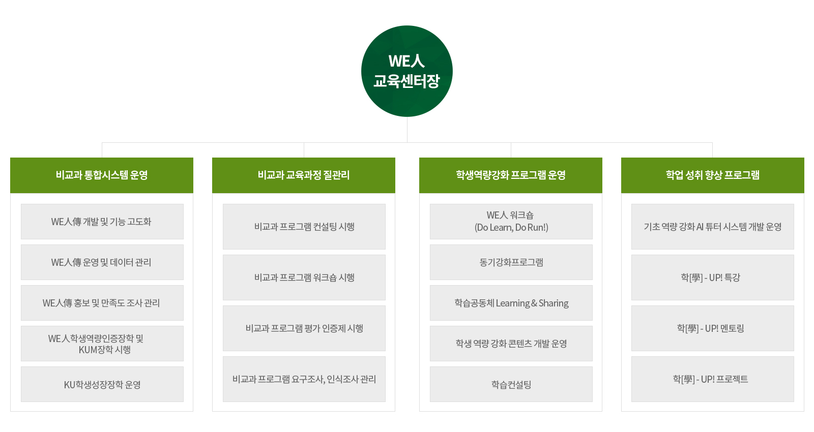 전공(담당업무) 연락처 WE人교육센터장 0473 행정총괄, 위인전운영 및 관리 4210 비교과평가인증 3519 학업특강, 학습컨설팅, 멘토링 4241 학습법워크숍, 학습공동체, 창의역량 4212 AI튜터, 동기강화, 온라인학습, 창의역량 4212 행정지원 및 기타문의 4210, 4212